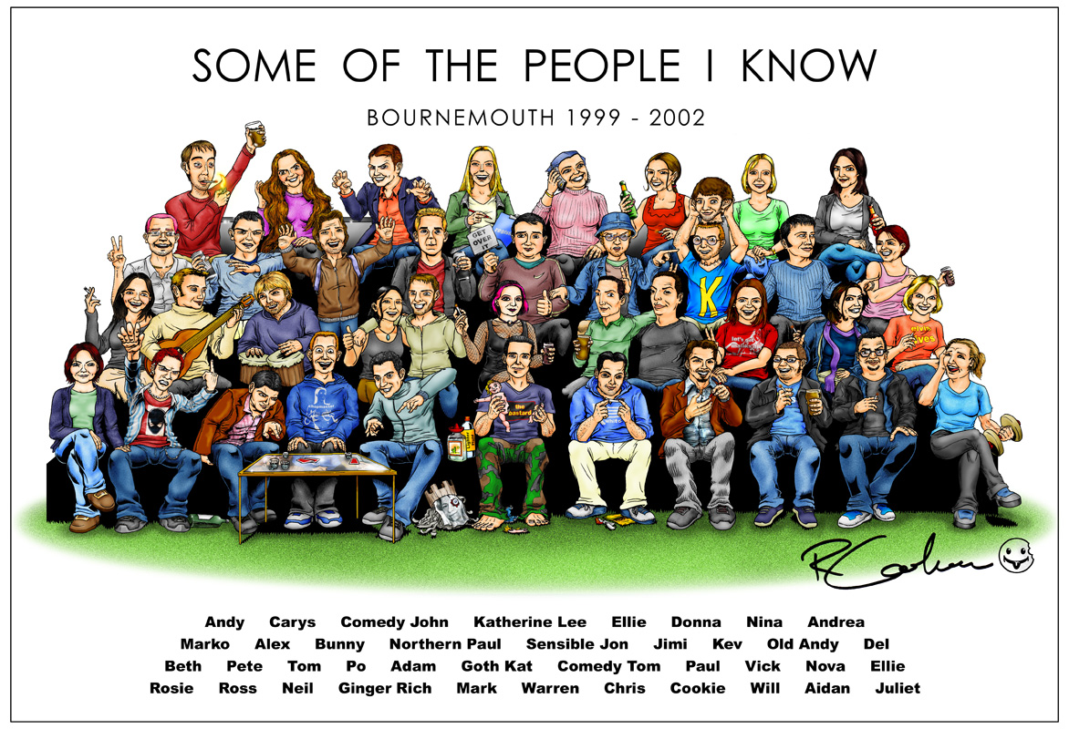 The poster on the left below was produced for my graduation in 2002. It is an original freehand drawing, assembled and coloured using Photoshop, caricaturising my classmates. The final posters were printed on A3 paper at 300dpi and sold on Graduation day.