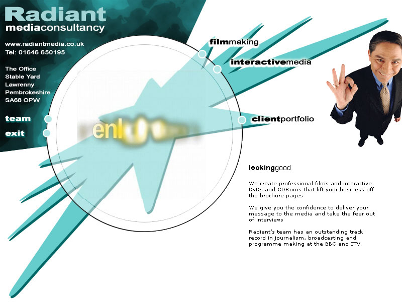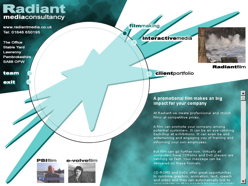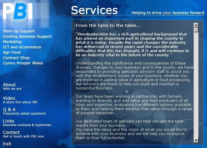 As an Interactive Designer at Radiant Media, I worked on a series of CD Rom packages produced to compliment corporate videos and portfolios. During a project for Pembrokeshire Business Initiative (PBI) I liaised with clients during the initial planning and then during implementation of the approved designs.